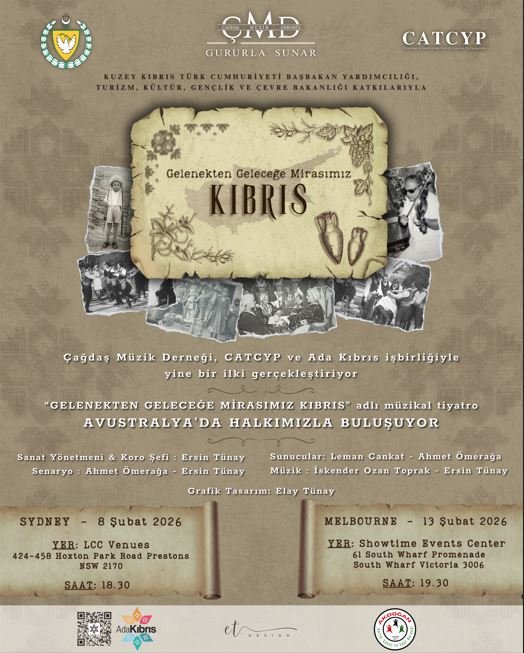 Çağdaş Müzik Derneği (ÇMD), Chamber of Australian Turkish Cypriot Professionals ( CATCYP ) ile Akdoğan Kültür Sanat ve Spor Derneği (AKSAD ) işbirliği, Başbakan Yardımcılığı Turizm, Kültür, Gençlik ve Çevre Bakanlığı’nın katkılarıyla, Avustralya’da “Gelenekten Geleceğe Mirasımız Kıbrıs”  adlı müzikal tiyatro sahneleyecek.