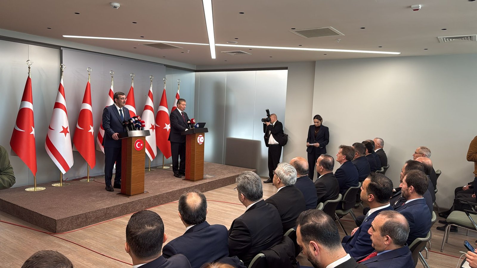 Günübirlik temaslarda bulunmak üzere ülkeye gelen Türkiye Cumhuriyeti Cumhurbaşkanı Yardımcısı Cevdet Yılmaz, Ercan Havalimanı’nda Başbakan Ünal Üstel ile birlikte ortak basın toplantısı düzenledi.